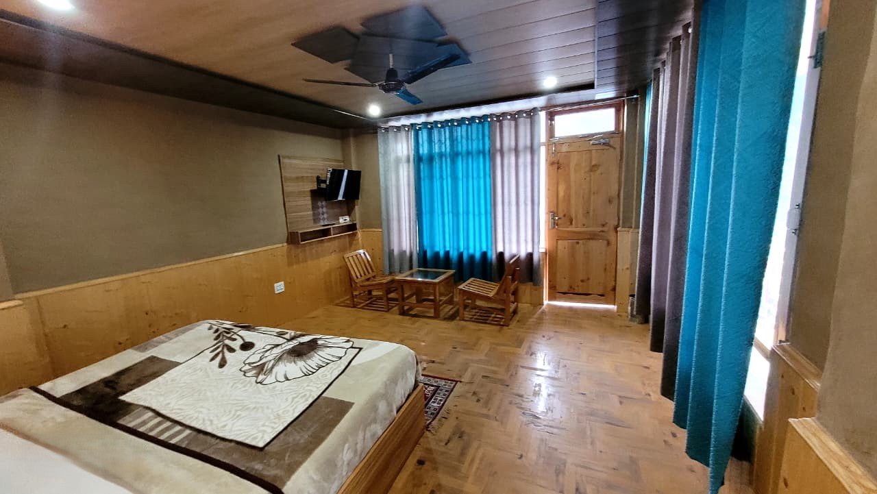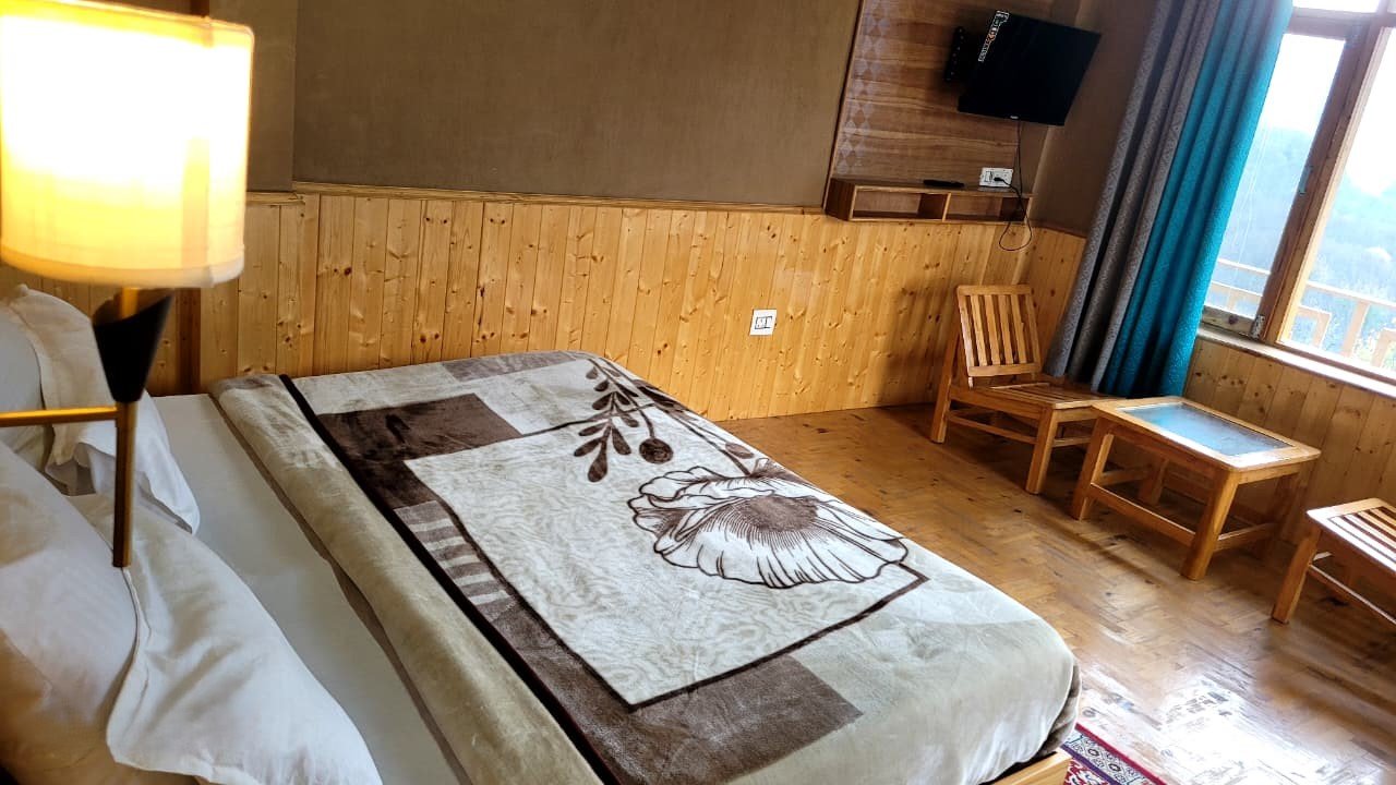 The room opens up to a private balcony that frames panoramic views of the Himalayan mountains. Enjoy peaceful mornings as sunlight touches the peaks, or unwind in the evening with the cool mountain breeze and a stunning natural backdrop. The balcony becomes your personal outdoor sanctuary—perfect for reading, sipping tea, or simply appreciating the silence and grandeur of Manali’s landscape.